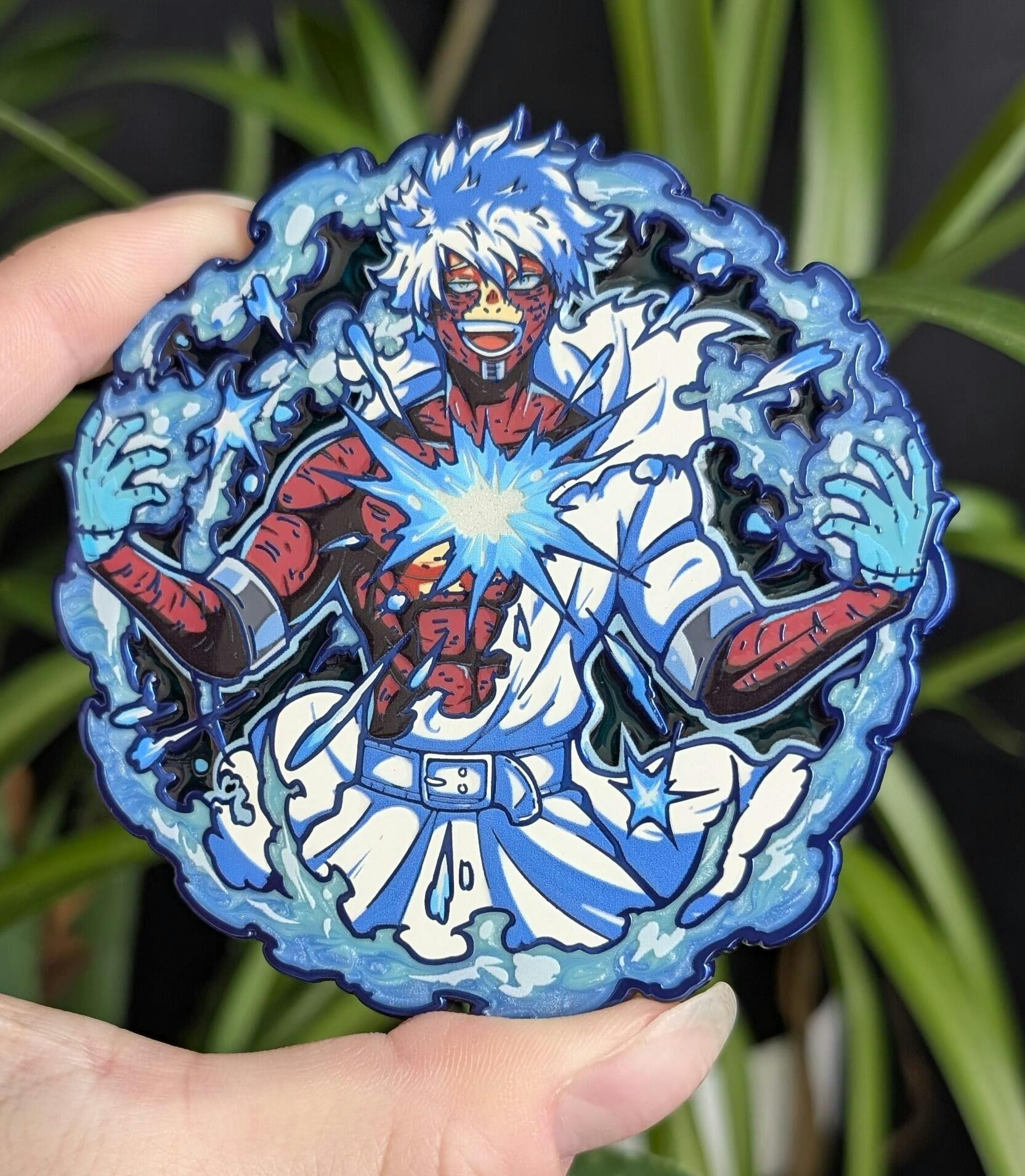 Variant 1: 3.25” Blue Chrome Plating Stained glass for darker areas in the flames, Flames in chest to have glitter, Dark blue parts of the outer flames to be pearl swirl, Light blue flames to be pearl no swirl + glitter, Hard enamel, Screen print details